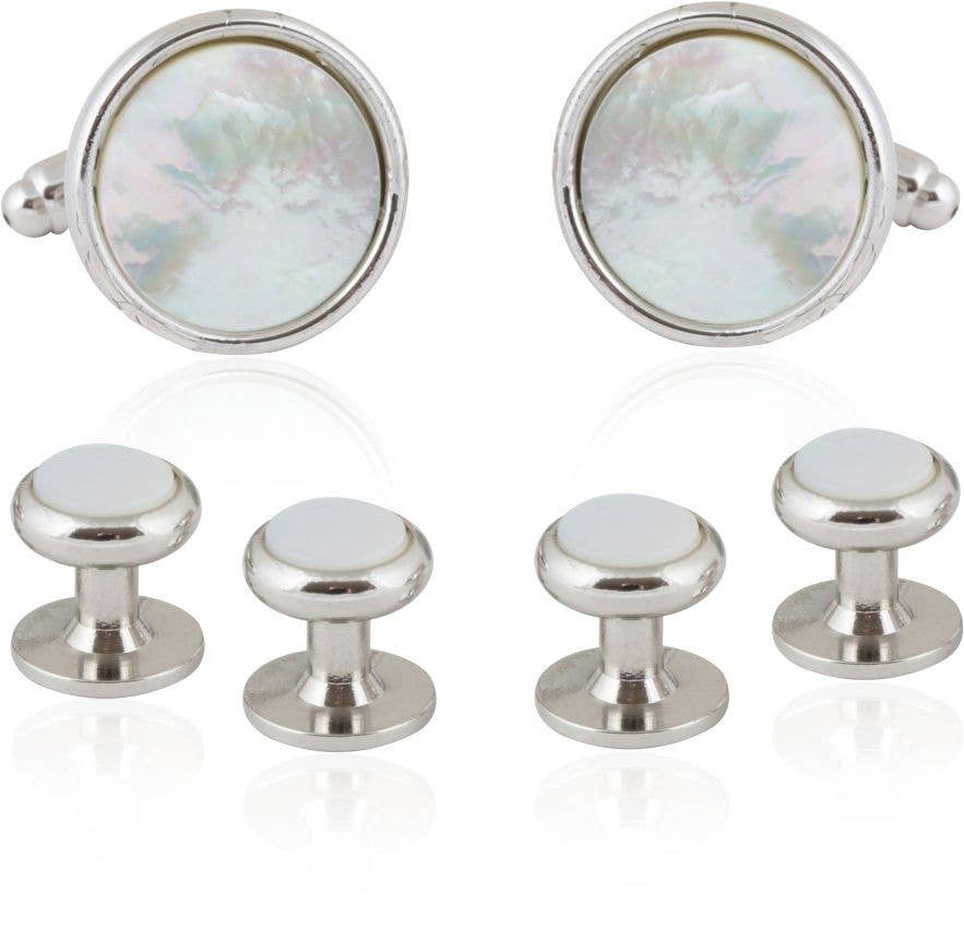 Dress up any of your favourite French shirts with this pearl formal set. It includes four different button studs as well as two matching cufflinks to complete the set. The set is easy to put in place and has a formal circular design. Each piece has a genuine mother of pearl insert that you can't miss. Give the gift of style to a loved one with these set or someone you really respect, or use it to help you look your best.