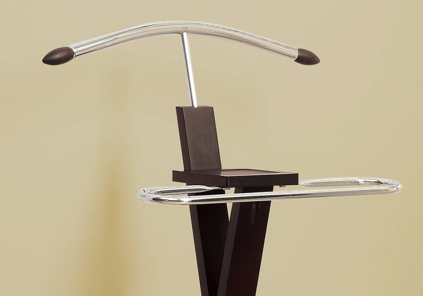 Designed to organise your outfit, this sophisticated cappuccino and chrome valet will be a stylish addition to your bedroom/dressing room. The stand offers a form-fitting hanger to hang a shirt or jacket, an accessory tray to place your keys or wallet, and trouser bar to neatly hang your trousers.